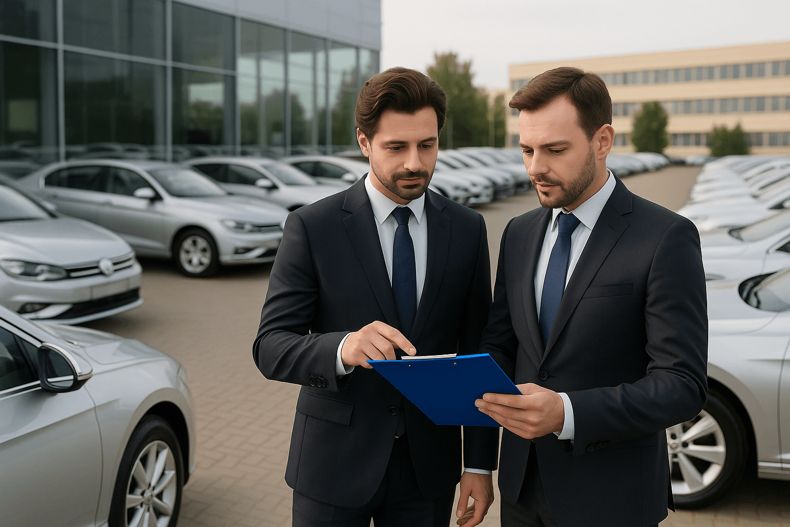 Dwóch menedżerów flot samochodowych analizuje dokumenty na tle parkingu z flotą pojazdów firmowych – profesjonalna scena biznesowa